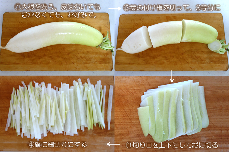 今回は、オーソドックスな細長い切り干し大根の切り方を紹介します。