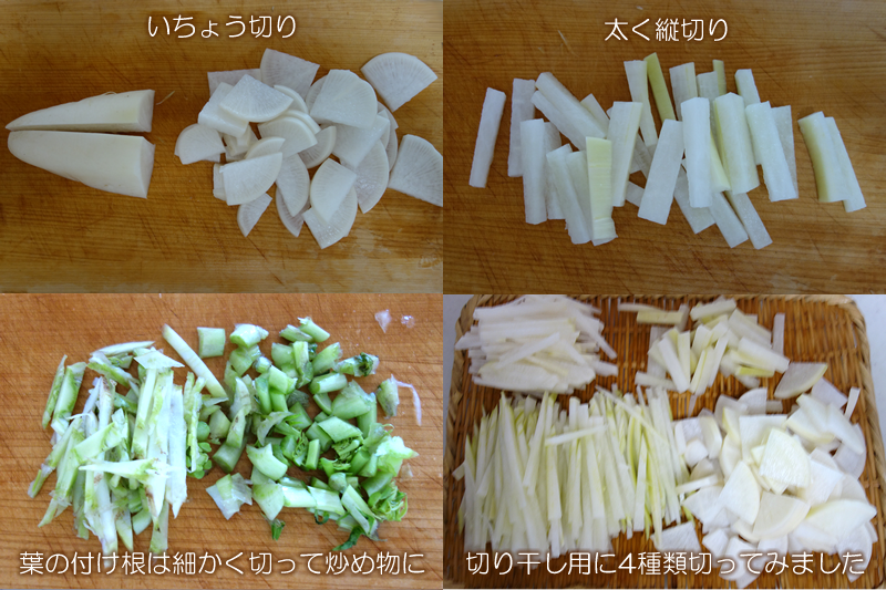他にも色々な形で切ってみました。上記の細切りの他に、中細、太目、いちょう切りにしました。